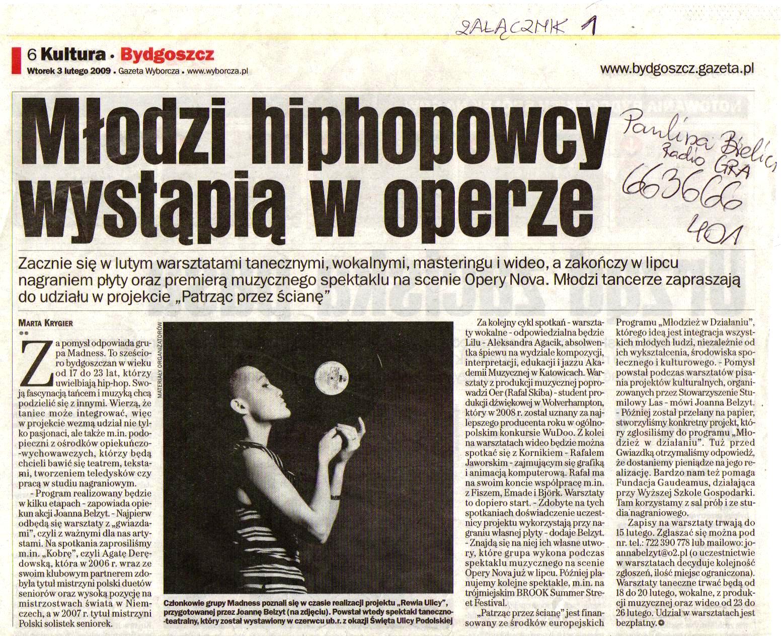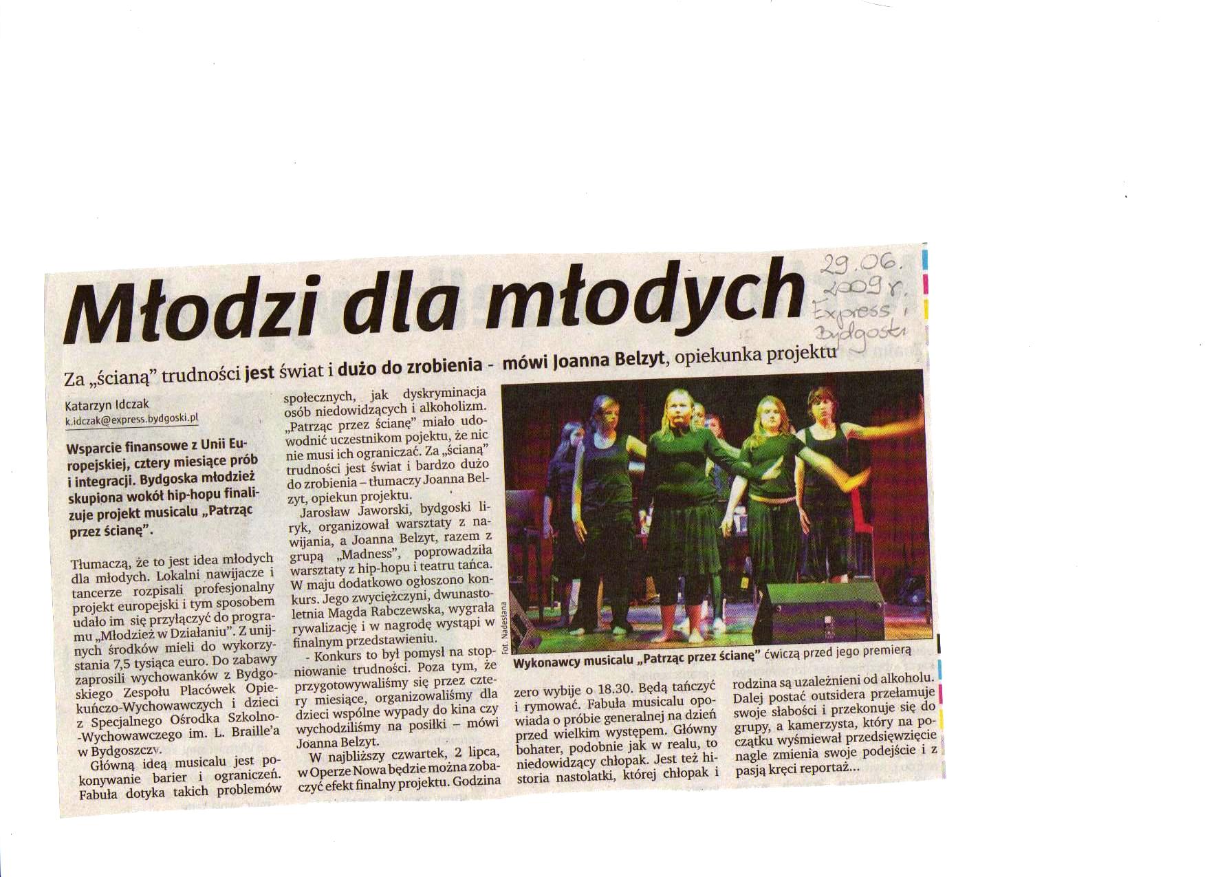 W czerwcu nastąpiło połączenie się grup i praca zbiorowa, która trwała do początku lipca. Całość została pokazana 2. lipca w formie scenicznej w postaci miuzikalu „Patrząc przez ścianę” w Operze Nova w Bydgoszczy. Opiekę liryczną nad projektem objął Jarek Jaruszewski <Biszu>, sceniczną Joanna Belzyt <mroo>, a promocją i produkcją zajęła się firma Everysound i Marcin Jaruszewski. W skład zespołu MADNESS wchodzą: Michał Niedbała <Specu> – koordynator, Piotr Maciejewski <MaciuHH>, Szymon Perz <Person>, Diana Rusinek <Ladydi>, Anna Rząca, Monika Szulgit <Monixxx>. Oprócz nich w miuzikalu wystąpili: Łukasz Rutkowski <Azja>, Łukasz Nitecki <Niteź>, Mariusz Niedbała <Dżefrej> Zuzanna Naskręt, Bartosz Ostrowski, Magdalena Rabczewska, Patryk Kulpa, Ula Radzik oraz podopieczne z ośrodka opiekuńczo-wychowawczego na ul. Toruńskiej 272: Marysia Dziennik, Natalia Dziuba, Marta i Karolina Witkowska, Klaudia i Paulina Woźniach.