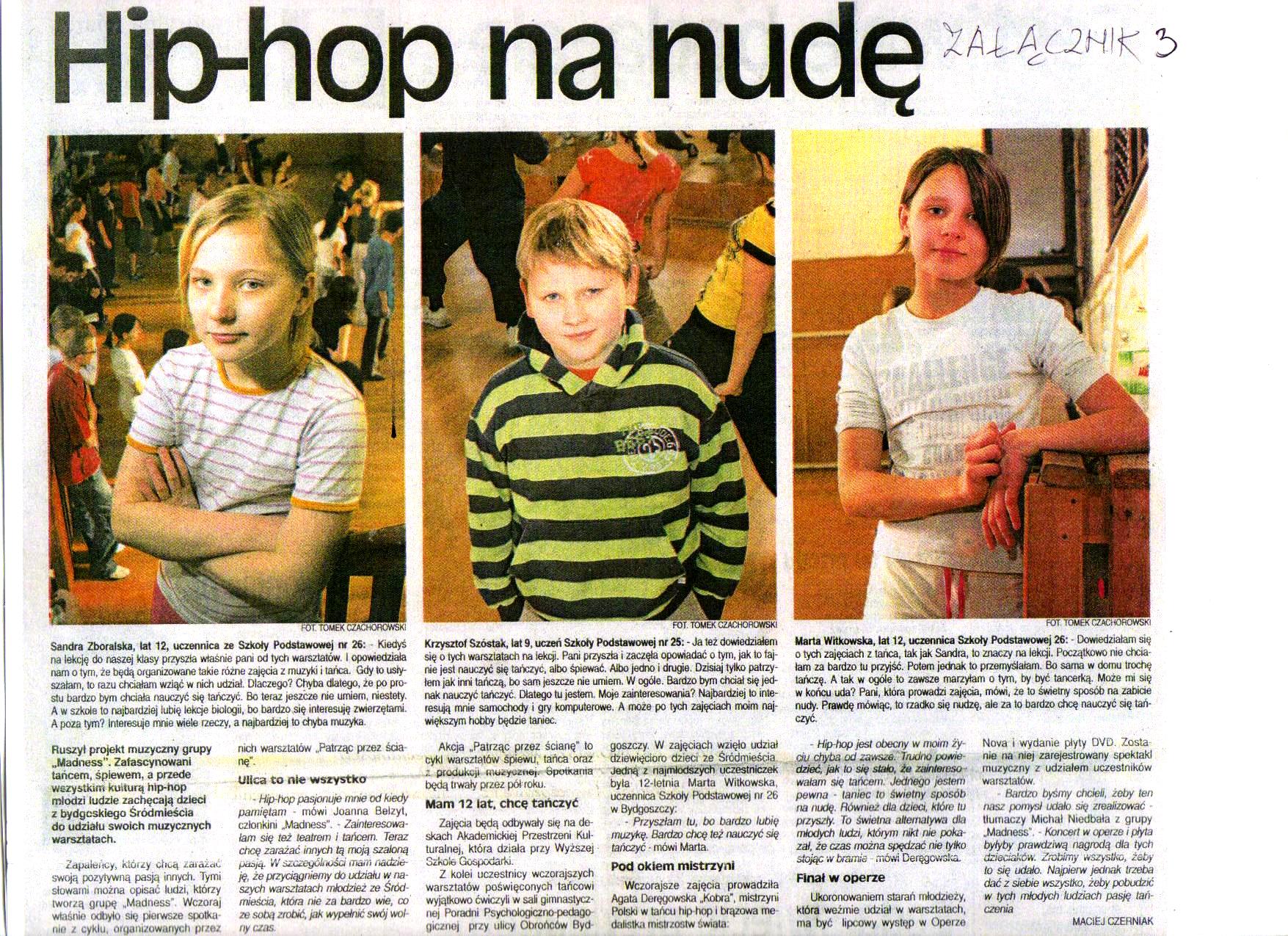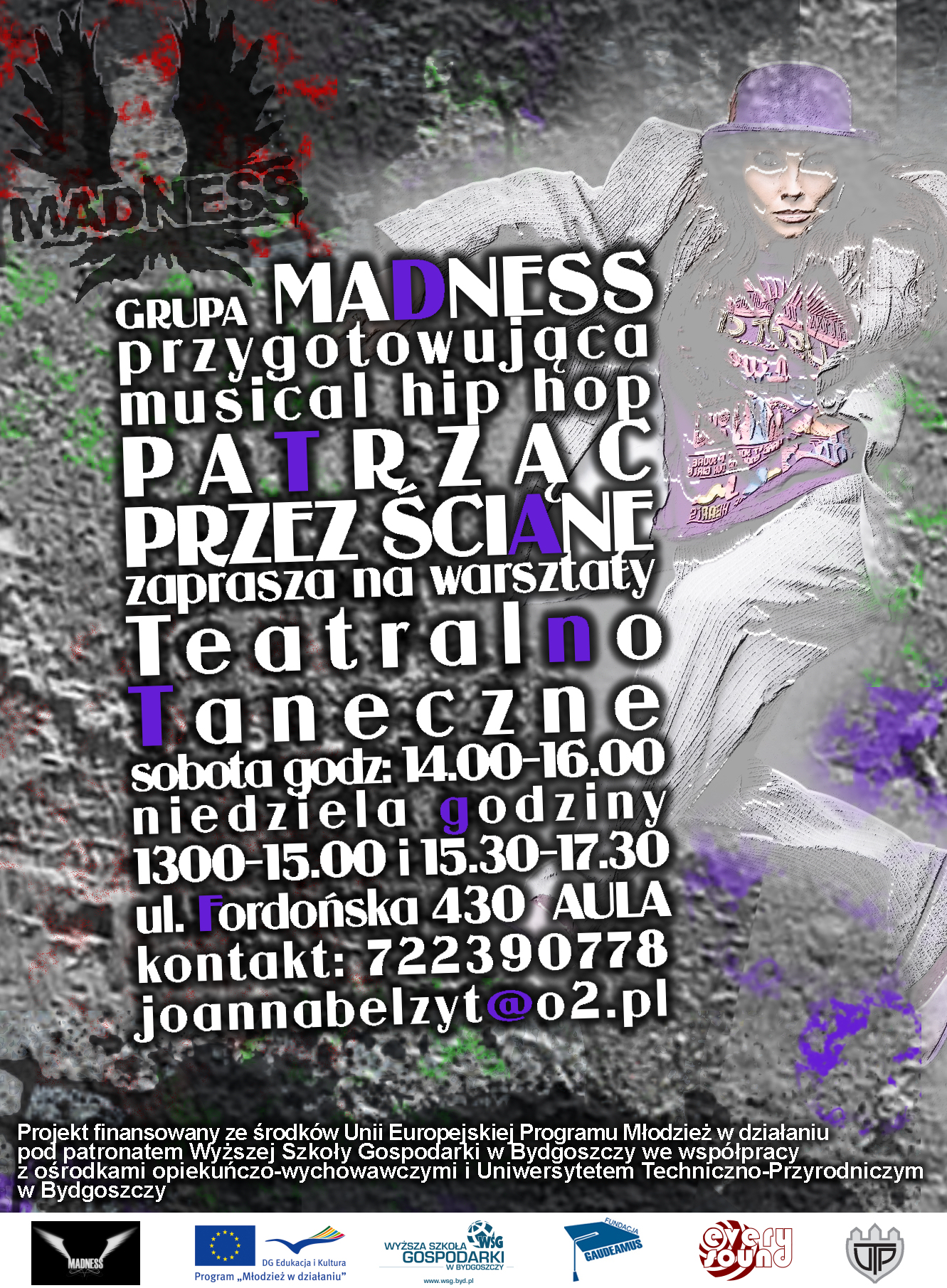 Grupa „MADNESS” liczy 6 osób w wieku od 17 do 23 lat. Łączy nas wspólna pasja – kultura hip hop i chęć pomocy innym. Poznaliśmy się ponad rok temu na warsztatach przedprojektowych projektu „Rewia Ulicy” odbywających się w Wyższej Szkole Gospodarki w Bydgoszczy. Nagraliśmy parę układów hiphopowych z młodzieżą ze Śródmieścia podczas projektu „Rewia Ulicy”. Więc postanowiliśmy razem stworzyć wspólny projekt, aby móc wykorzystać nasze pasje do działań społecznych.