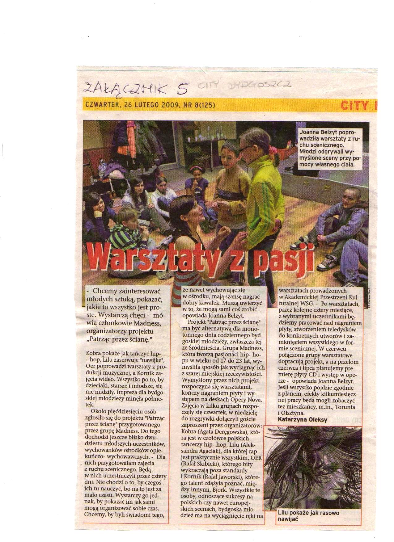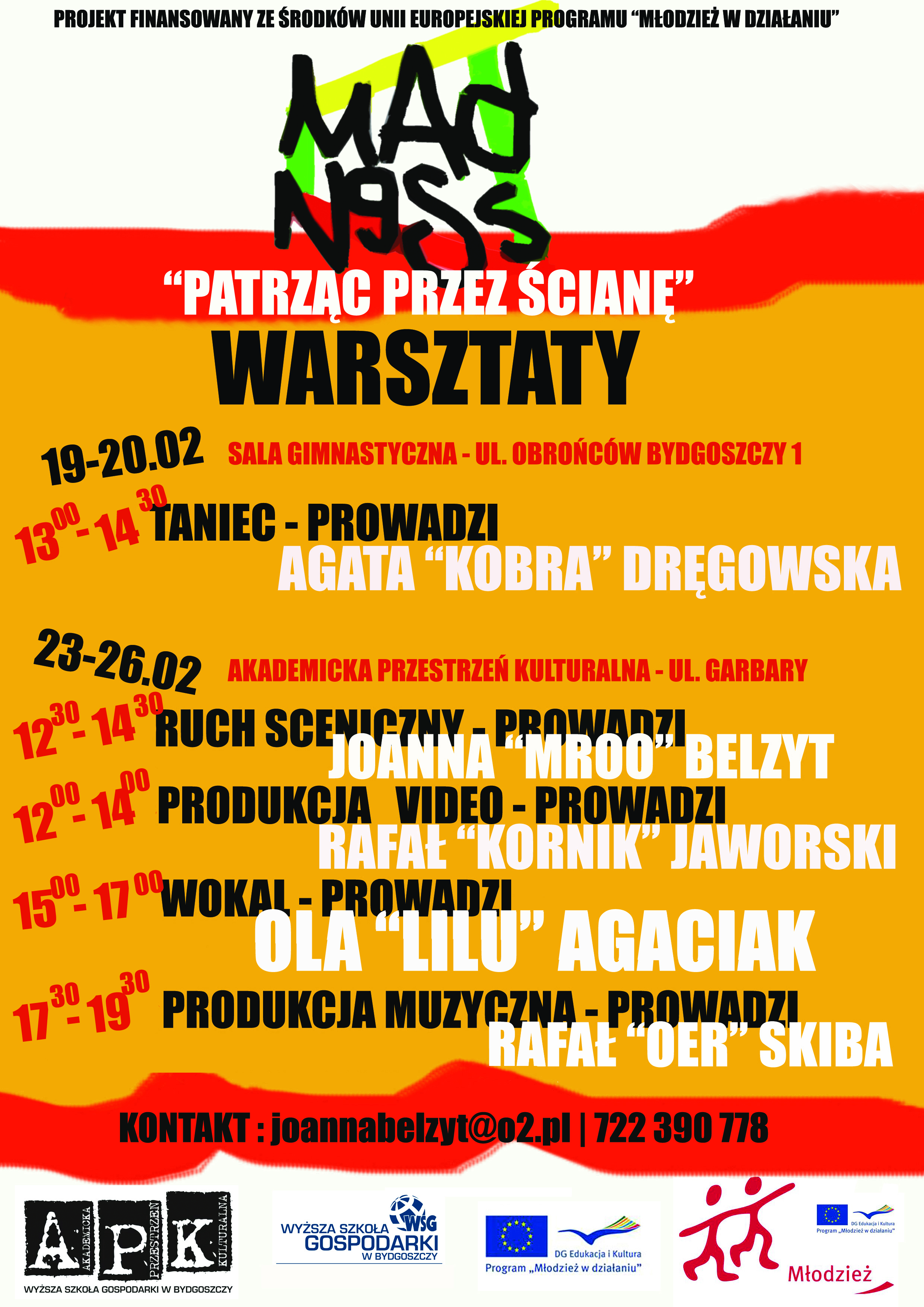 Wraz z uczestnikami tych warsztatów przez następnie 4 miesiące w grupach warsztatowych (po 5-8 osób) pracowaliśmy nad stworzeniem do konkretnych utworów i zamknięciem tego w formie scenicznej. Spotykaliśmy się 2x w tygodniu na terenie Wyższej Szkoły Gospodarki, Uniwersytetu Techniczno-Przyrodniczego w MDKu oraz w ośrodkach opiekuńczo-wychowawczych w Bydgoszczy. W tych ramach warsztatów zorganizowaliśmy konkurs i koncert hiphopowy, pojechaliśmy, m.in. na festiwal młodych aktywnych do Koluszek „INFEKCJA KULATURALNA”, do Lublina na Festiwal Teatralny ZWIERCIADŁA, oraz do Olsztyna pokazać efekty naszej pracy.