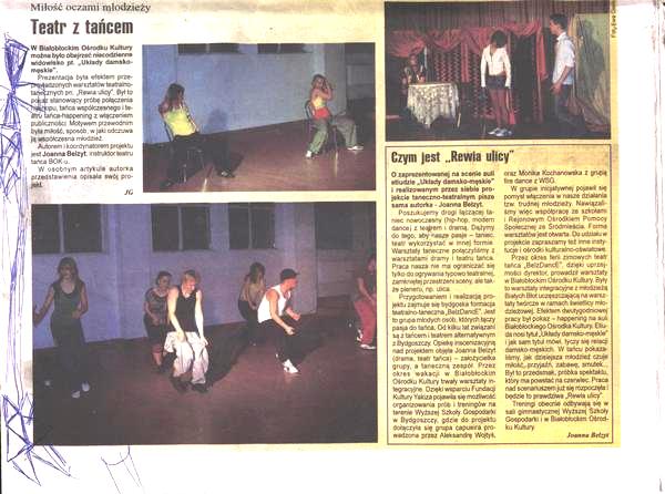 Nowatorski projekt taneczno-teatralny realizowany w Bydgoszczy od października 2007 do maja 2008r ze środków europejskich Programu Młodzież w Działaniu. Tematem naszego projektu jest praca w ramach sztuki teatralno-tanecznej, a celem stworzenie spektaklu. Poszukujemy drogi łączącej taniec nowoczesny (hip hop, breakdance) z teatrem i dramą. Dążymy do tego aby nasze pasje – taniec, teatr wykorzystać w innej formie. Warsztaty taneczne (breakdance, hip hop) połączyliśmy z warsztatami dramy i teatru tańca. Praca nasza nie ma ograniczać się tylko do ogrywania typowo teatralnej, zamkniętej przestrzeni sceny, ale także pleneru, np. ulica.Przygotowaniem i realizacja projektu zajmuje się bydgoska formacja teatralno-taneczna Belzdance. Jest to grupa młodych osób, których łączy pasja do tańca. Od kilku lat związani są z tańcem i teatrem alternatywnym z Bydgoszczy, Nakła, Chełmna, Słupska i Torunia. Opiekę inscenizacyjną nad grupą objęła Joanna Belzyt – liderka grupy, a taneczną Łukasz Kosicki (breakdance) i Magdalena Przepierka (hip hop). Przez okres wakacji trwały warsztaty integracyjne. Dzięki wsparciu Fundacji Kultury Yakiza pojawiła się możliwość organizowania prób i treningów na terenie Wyższej Szkoły Gospodarki w Bydgoszczy, a dzięki Łukaszowi Kosickiemu na terenie Białobłodzkiego Ośrodka Kultury. Dodatkowo obydwie instytucje zaoferowały pomoc przy dalszej realizacji projektu.W grupie inicjatywnej pojawił się pomysł włączenia w nasze działania tzw. trudnej młodzieży. Nawiązaliśmy więc współpracę z szkołami i Rejonowego Ośrodka Pomocy Społecznej. Oprócz ulotek i plakatów jako element rekrutacji, w sobotę 29. września 2007 roku o godz.13:30 odbędzie się darmowy pokaz BelzDancE. Forma warsztatów jest otwarta. Zapraszamy też do współpracy inne ośrodki kulturalno-naukowe do udziału w projekcie.