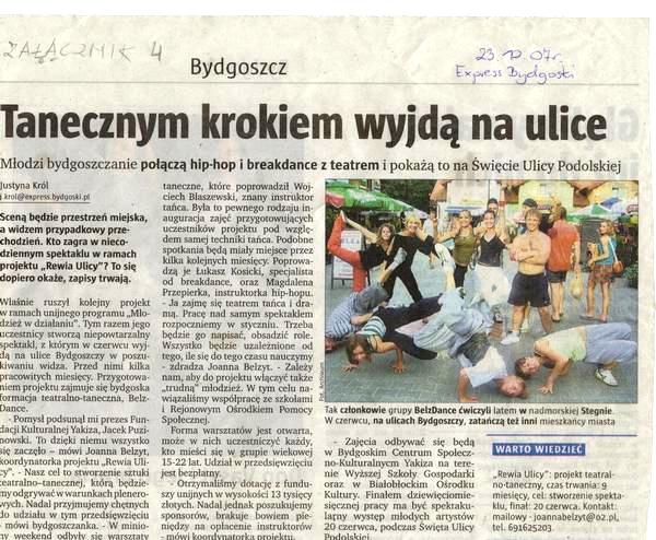 Tematem i efektem projektu Rewia Ulicy jest stworzenie spektaklu taneczno-teatralnego o nowatorskiej formule łączącej taniec nowoczesny (hip-hop, breakdance) z teatrem i dramą. Forma spektaklu wychodzi poza przestrzeń zamkniętą, czyli typowo teatralną i obejmuje miejsca plenerowe, min. ulicę.Przygotowaniem i realizacja projektu zajmuje się bydgoska formacja teatralno-taneczna Belzdance. Jest to grupa młodych osób, których łączy pasja do tańca. Od kilku lat związani są z tańcem i teatrem alternatywnym z Bydgoszczy, Nakła, Chełmna i Torunia. Pomysł zrobienia czegoś nowego i kreatywnego w tańcu pojawił się wiosną 2007 roku. Opiekę inscenizacyjną nad grupą objęła Joanna Belzyt – liderka grupy, a oprawą taneczną Łukasz Kosicki (breakdance) i Magdalena Przepierka (hip hop). Przez okres wakacji trwały warsztaty integracyjne. Dzięki wsparciu Fundacji Kultury Yakiza pojawiła się możliwość organizowania prób i treningów na terenie Wyższej Szkoły Gospodarki w Bydgoszczy. Dodatkowo uczelnia oraz Białobłodzki Ośrodek Kultury zaoferowały pomoc przy dalszej realizacji projektu.