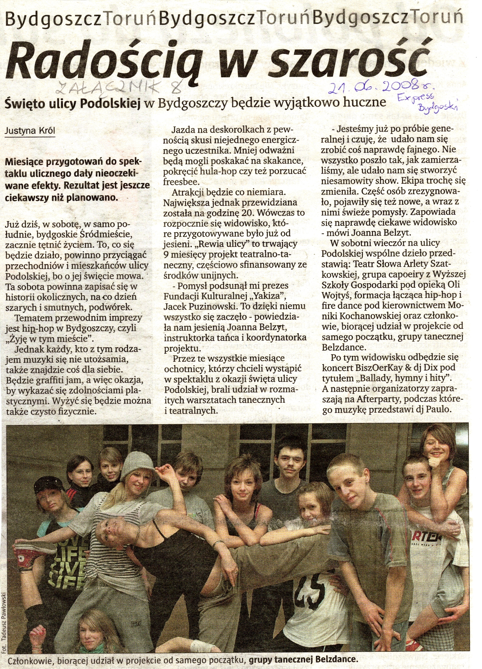 4. 20 czerwiec 2008r- Obchody Święta ul. Podolskiej, tj. pokazowe przejście ul. Podolską, parada tancerzy, bębniarzy, ogniarzy, dojście do BCSK Yakiza, pokaz premierowy “Rewii Ulicy”